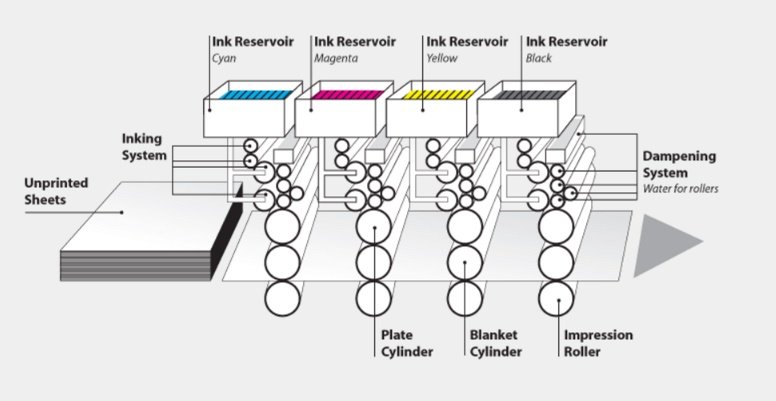 การพิมพ์สีในระบบออฟเซตนั้น ในการพิมพ์แต่ละสีต้องใช้เพลทแม่พิมพ์หนึ่งอัน ดังนั้นการพิมพ์ 4 สี (CMYK)ก็ต้องใช้เพลตแม่พิมพ์ 4 อัน การพิมพ์ภาพ 4 สี สามารถทำได้อย่างสะดวก เพราะสามารถปรับตำแหน่งของแม่พิมพ์และกระดาษให้ลงในตำแหน่งที่ตรงกันของแต่ละสีได้ง่าย ตรงตามไฟล์อาร์ตเวิร์คที่ออกแบบไว้