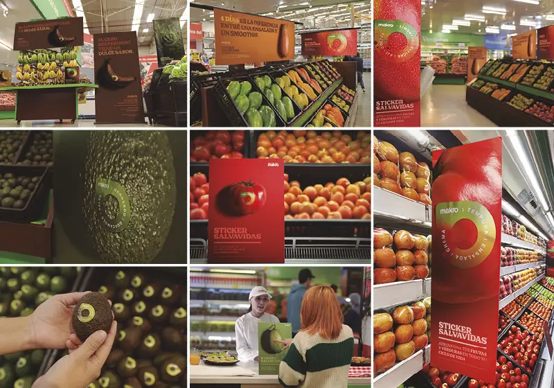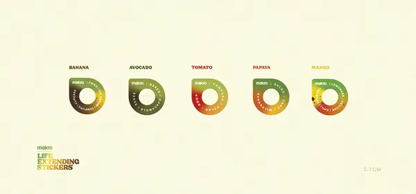 เป็นเหตุผลให้ห้าง แม็คโคร (Makro Supermarkets) ในประเทศโคลอมเบีย จับมือกับเอเจนซี่ Grey สร้างสรรค์นวัตกรรมอย่าง Makro Life Extending Stickers ที่สามารถช่วยลดปริมาณขยะอาหารได้อย่างยั่งยืน โดยการเปลี่ยนสติกเกอร์บอกชื่อแบรนด์ที่ติดไว้บนผักและผลไม้ซึ่งไม่สามารถสร้างประโยชน์อื่นใด มาเป็นการใช้สติกเกอร์แบบที่มีเฉดสีเหมือนผักผลไม้ชนิดต่าง ๆ เพื่อใช้บ่งบอกระดับความสุกงอมของผักผลไม้แต่ละประเภท
